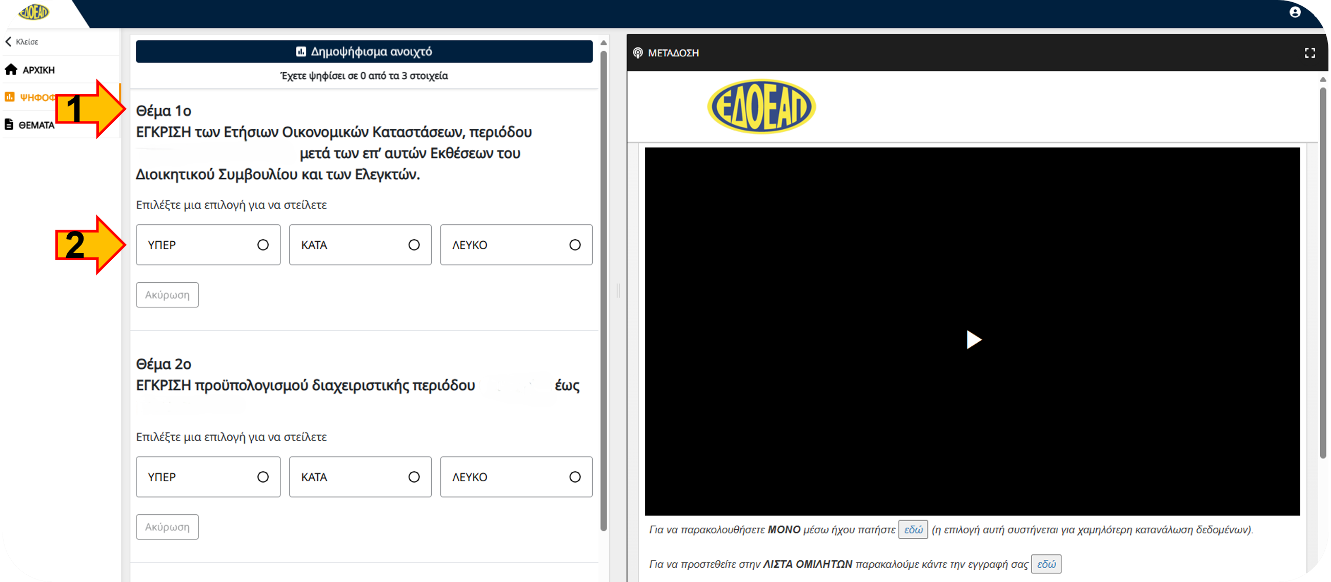 Στην αριστερή πλευρά της οθόνης, θα διεξάγεται η ψηφοφορία, όταν εκκινήσει τη διαδικασία ο Πρόεδρος της ΓΣ.