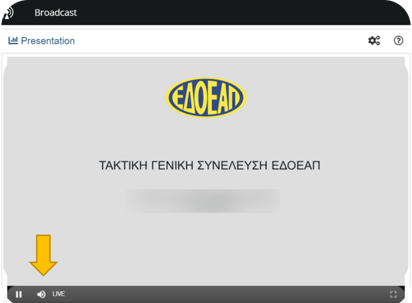 Στη «σύνδεση μέσω τηλεφώνου» το τηλεφωνικό κέντρο σάς καλεί, στο καταχωρισμένο τηλέφωνο, για να σας συνδέσει στη ζωντανή μετάδοση, όταν πλησιάζει η σειρά της τοποθέτησής σας. Μέχρι να σας δοθεί ο λόγος θα είστε σε σίγαση. Πριν μιλήσετε, βάλτε σε σίγαση (Mute) τον ήχο του υπολογιστή ώστε να ακούγεστε καθαρά (βλ. εικόνα και βέλος).