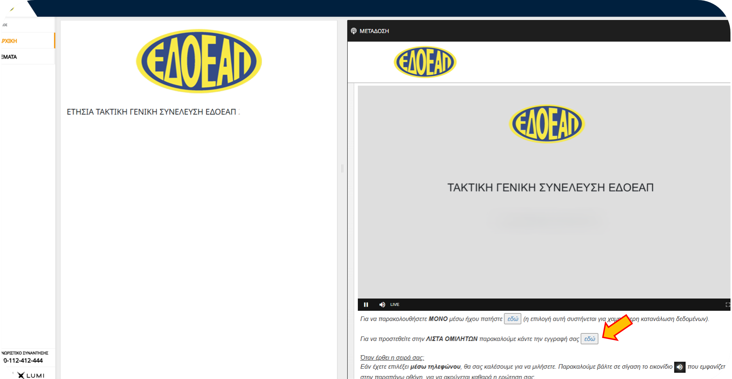 Για την εγγραφή σας στη λίστα ομιλητών, εάν θέλετε να μιλήσετε ζωντανά στην Τακτική Γενική Συνέλευση, πατήστε στον σύνδεσμο που υποδεικνύεται (βλ. εικόνα και βέλος).