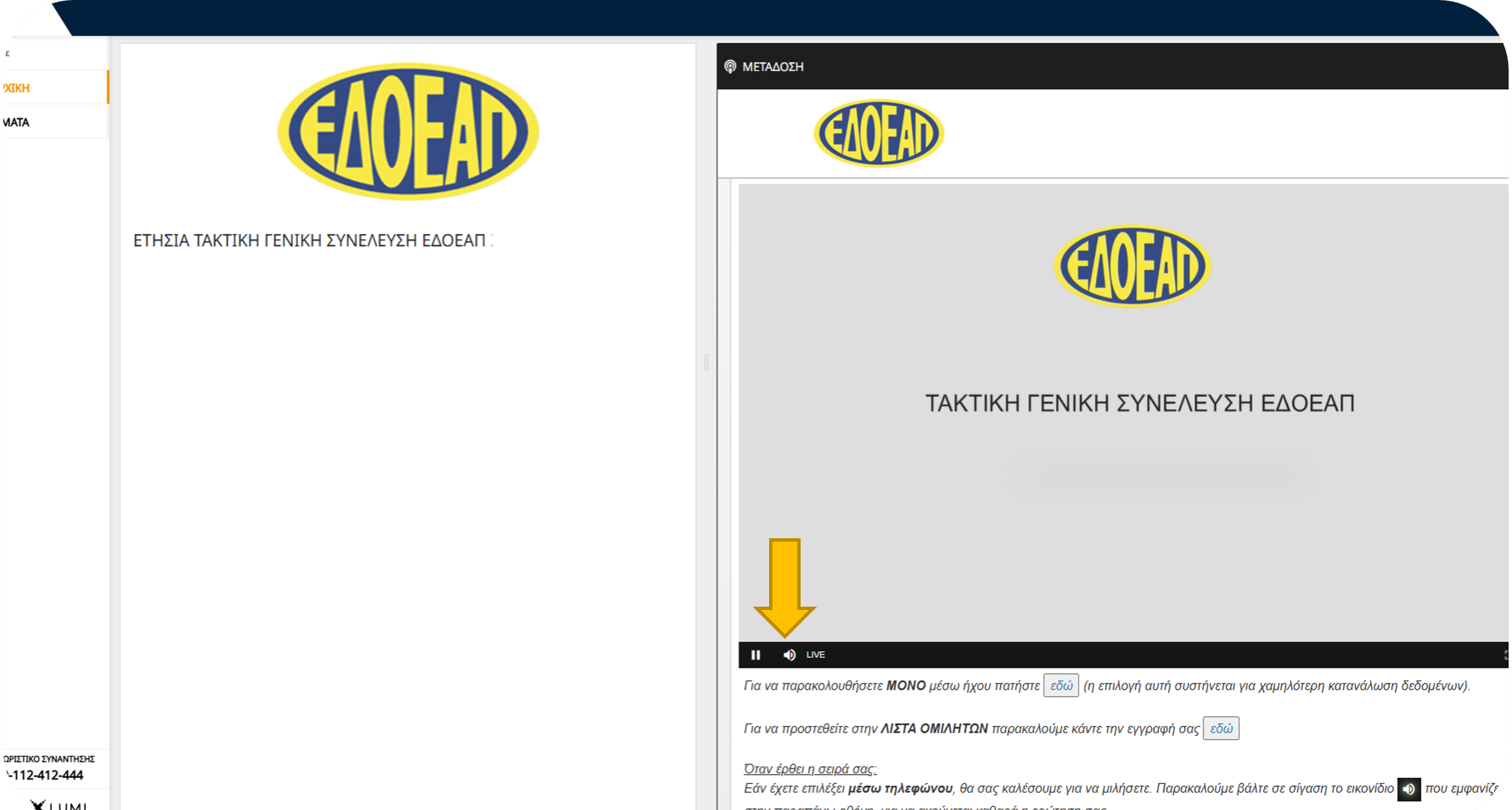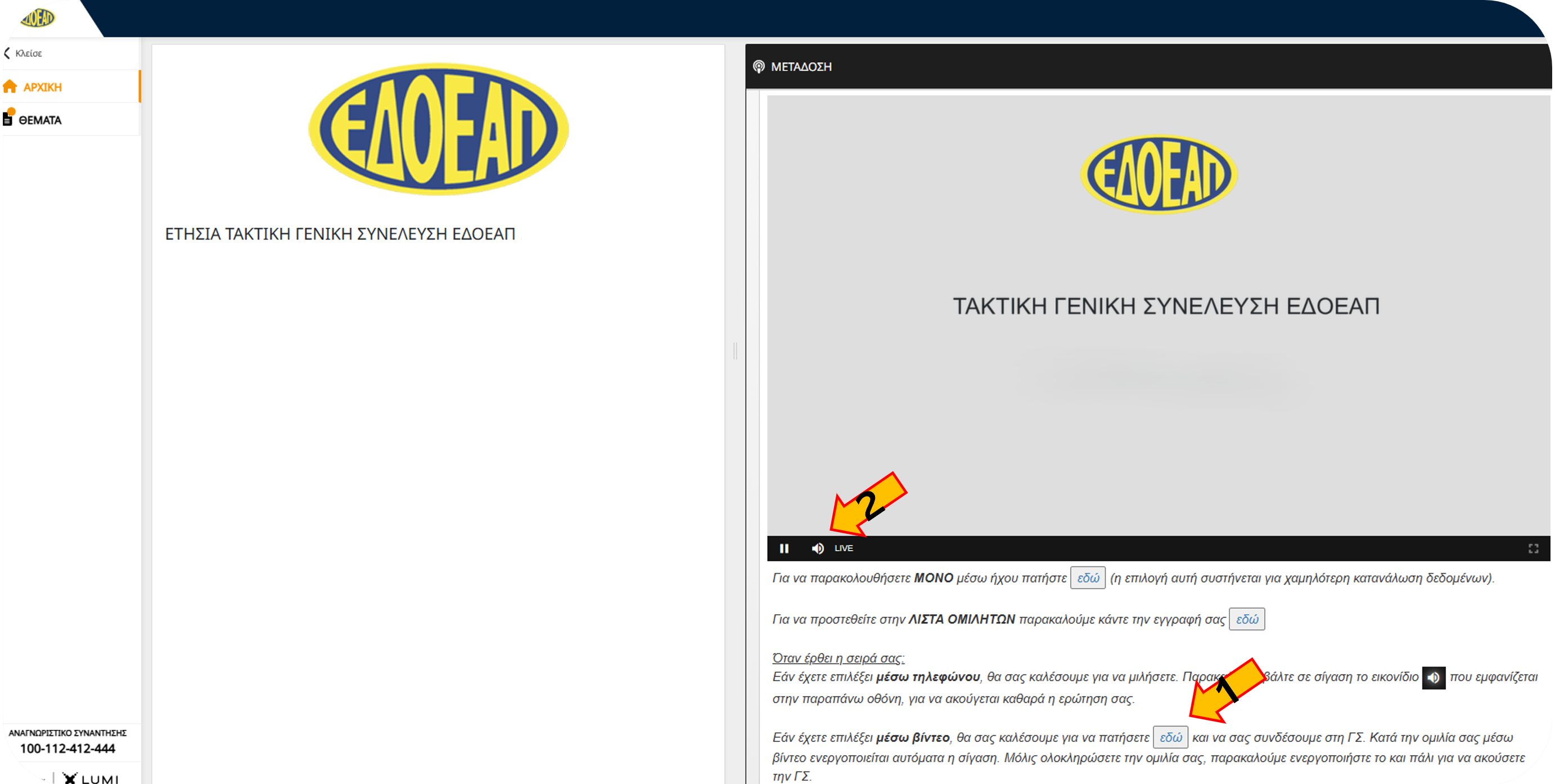 Για την παρακολούθηση της Τακτικής Γ.Σ. μόνο μέσω ακρόασης (χωρίς βίντεο) πατήστε την αντίστοιχη επιλογή όπως φαίνεται στην εικόνα. (Η επιλογή αυτή συστήνεται για χαμηλότερη κατανάλωση δεδομένων).