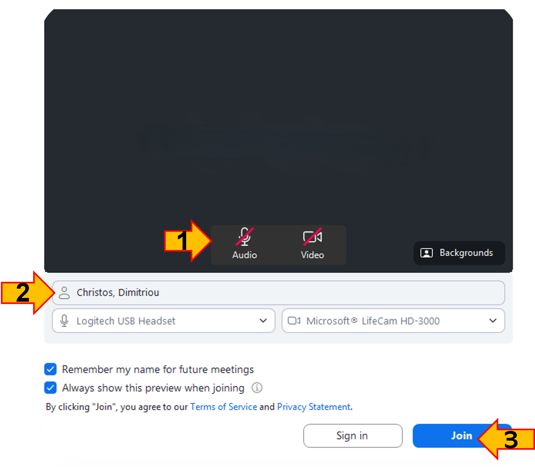 1. Προεπισκόπηση κάμερας (video preview) — εμφανίζει την εικόνα σας όπως θα φαίνεται στους υπόλοιπους συμμετέχοντες.